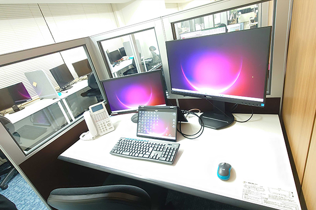 一般的なオフィスデスクではなく、一人ひとりのスペースを広々と確保しています。個人ロッカーも完備しているため、快適に働くことができます。